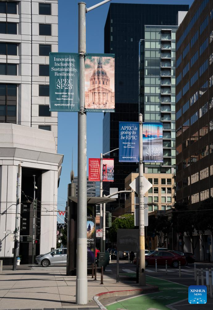 This photo taken on Nov. 7, 2023 shows banners depicting the upcoming 30th APEC Economic Leaders' Meeting outside the venue of the meeting in San Francisco, California, the United States. The 30th APEC Economic Leaders' Meeting is going to be held in San Francisco. (Photo by Li Jianguo/Xinhua)