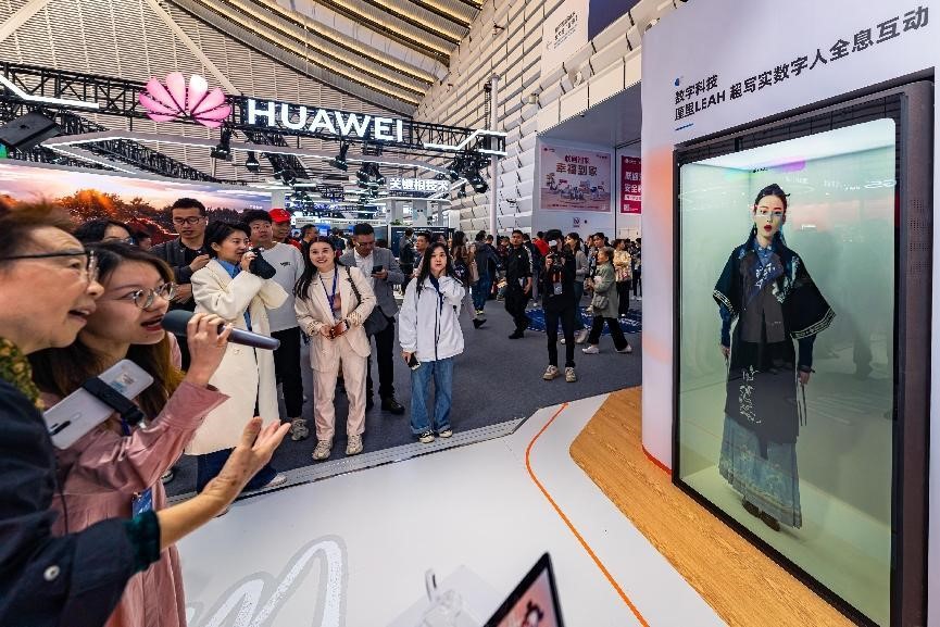 Visitors interact with a digital figure at the Light of Internet Expo during the 2023 World Internet Conference Wuzhen Summit in Wuzhen, Tongxiang, Jiaxing, east China's Zhejiang province, Nov. 7, 2023. (People's Daily Online/Zhang Feng)