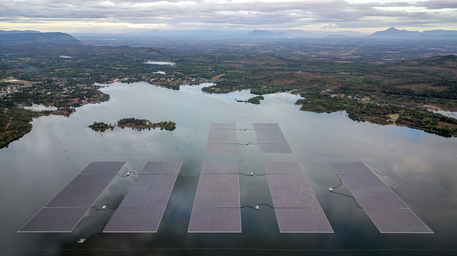 This aerial photo taken on Dec. 8, 2022 shows the floating solar farm built through partnership with a Chinese company in the Sirindhorn Dam in Ubon Ratchatani, Thailand. (Xinhua/Wang Teng)