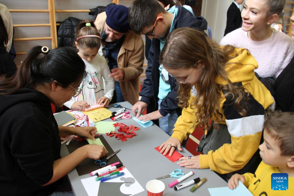 Children try to make Chinese paper cutting works during an activity titled "Chinese Culture and Technology Day" in Sofia, Bulgaria, on Nov. 11, 2023. The event was organized by the Confucius Institute in Sofia. (Photo by Marian Draganov/Xinhua)