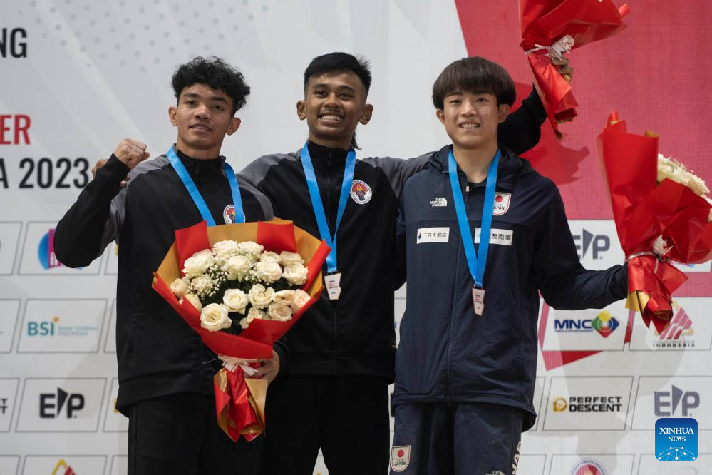 First placed Rahmad Adi Mulyono (C) of Indonesia, second placed Katibin Kiromal (L) of Indonesia and third placed Omasa Ryo of Japan pose on the podium during the awarding ceremony after the Final of Men Speed of IFSC Asian Qualifier Jakarta 2023 in Jakarta, Indonesia, Nov. 12, 2023. (Xinhua/Xu Qin)