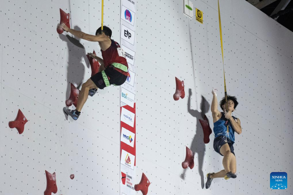 Rahmad Adi Mulyono (L) of Indonesia competes with his compatriot Katibin Kiromal during the Final of Men Speed of IFSC Asian Qualifier Jakarta 2023 in Jakarta, Indonesia, Nov. 12, 2023. (Xinhua/Xu Qin)