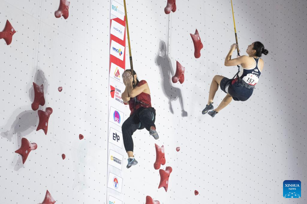 Deng Lijuan (L) of China competes against Jeong Jimin of South Korea during the Final of Women Speed of IFSC Asian Qualifier Jakarta 2023 in Jakarta, Indonesia, Nov. 12, 2023. (Xinhua/Veri Sanovri)