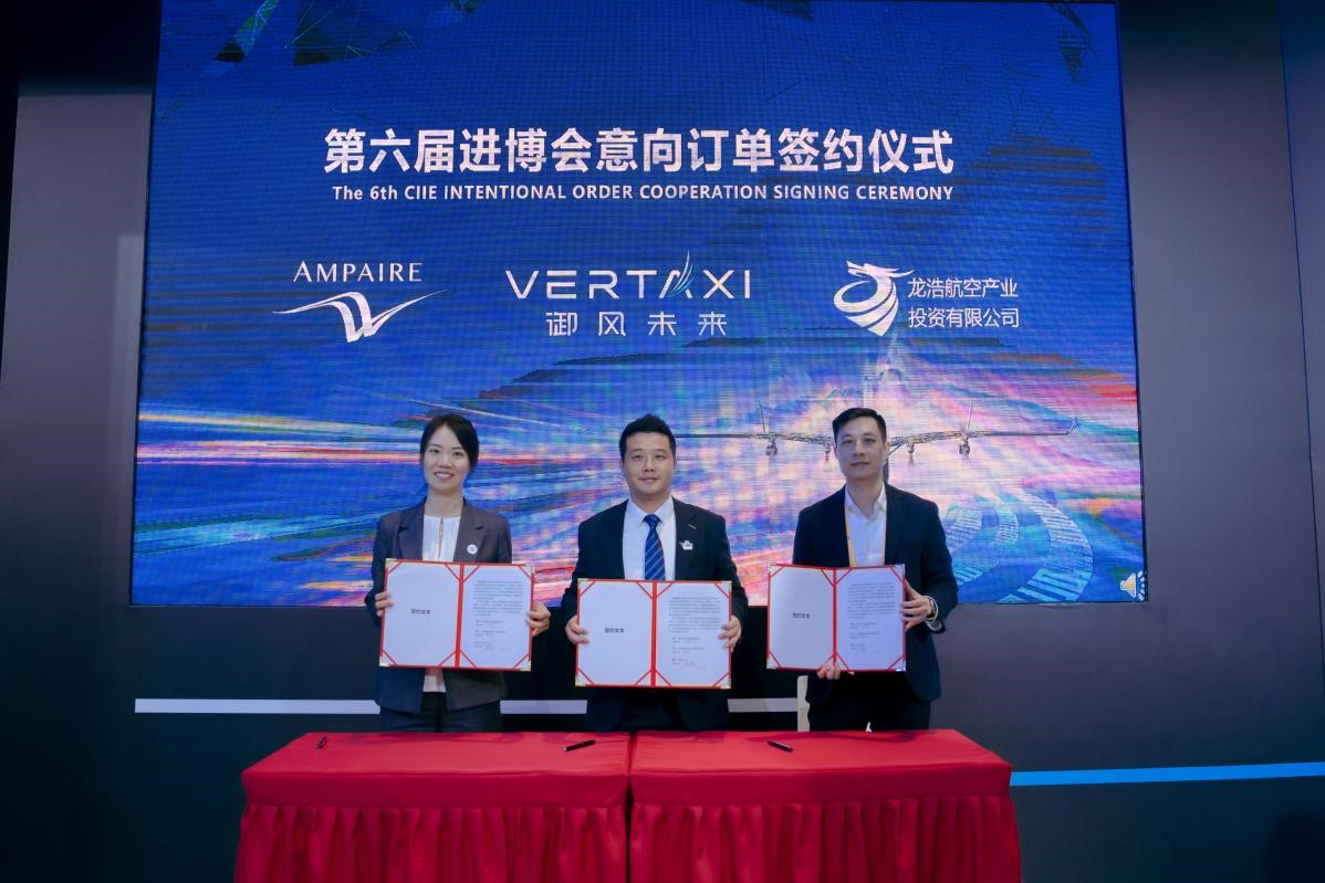 On November 6, Vertaxi, Ampaire, and China's Longhao Airlines signed an agreement on intentional orders at the sixth CIIE. The agreement includes intentional orders for 230 million yuan ($31.57 million) worth of products, covering 15 fully domestically-produced M1, five M1H hybrid variants jointly developed by Vertaxi and Ampaire, repair and maintenance equipment, and training services.