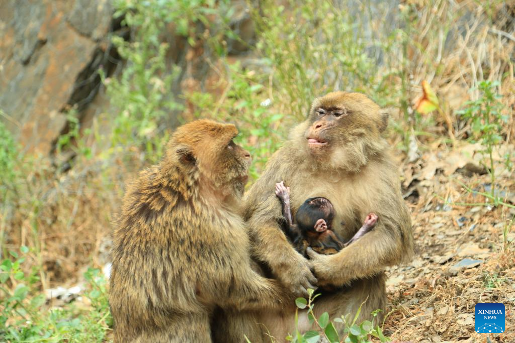 Monkeys are seen near Monkey Creek restaurant in Chiffa, Algeria, on May 14, 2023. Nestled 60 km south of Algeria's capital Algiers, the renowned Monkey Creek restaurant in Chiffa Gorge boasts a long history of a century and more. A photo wall inside showcases famous personalities, including Napoleon III, Prince Philip, and former Algerian leaders who visited the site. However, the centerpiece is a Chinese sign that reads "Huan Ying Guang Lin" (welcome). (CSCEC Algeria/Handout via Xinhua)