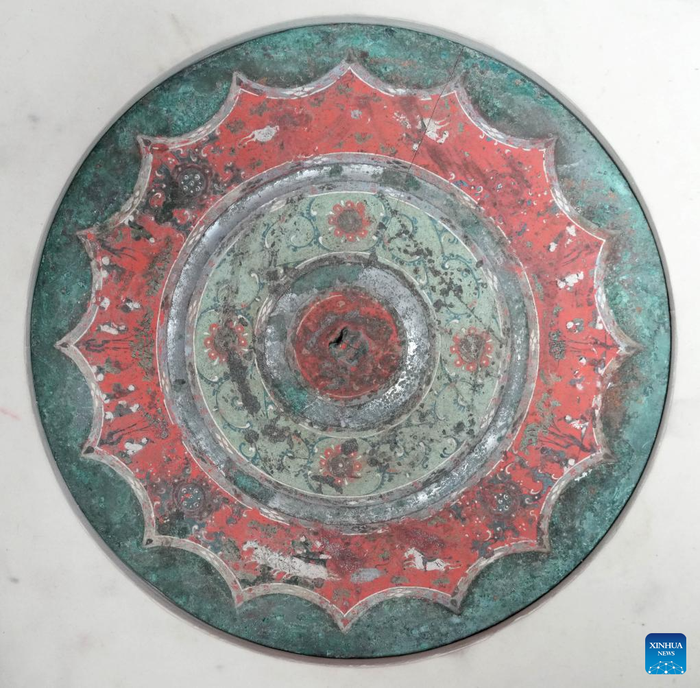 This photo taken on Aug. 25, 2023 shows part of a bronze mirror with colored patterns of figures, horses and carriages, collected at Xi'an Museum in Xi'an, northwest China's Shaanxi Province. (Xinhua/Wang Yuguo)