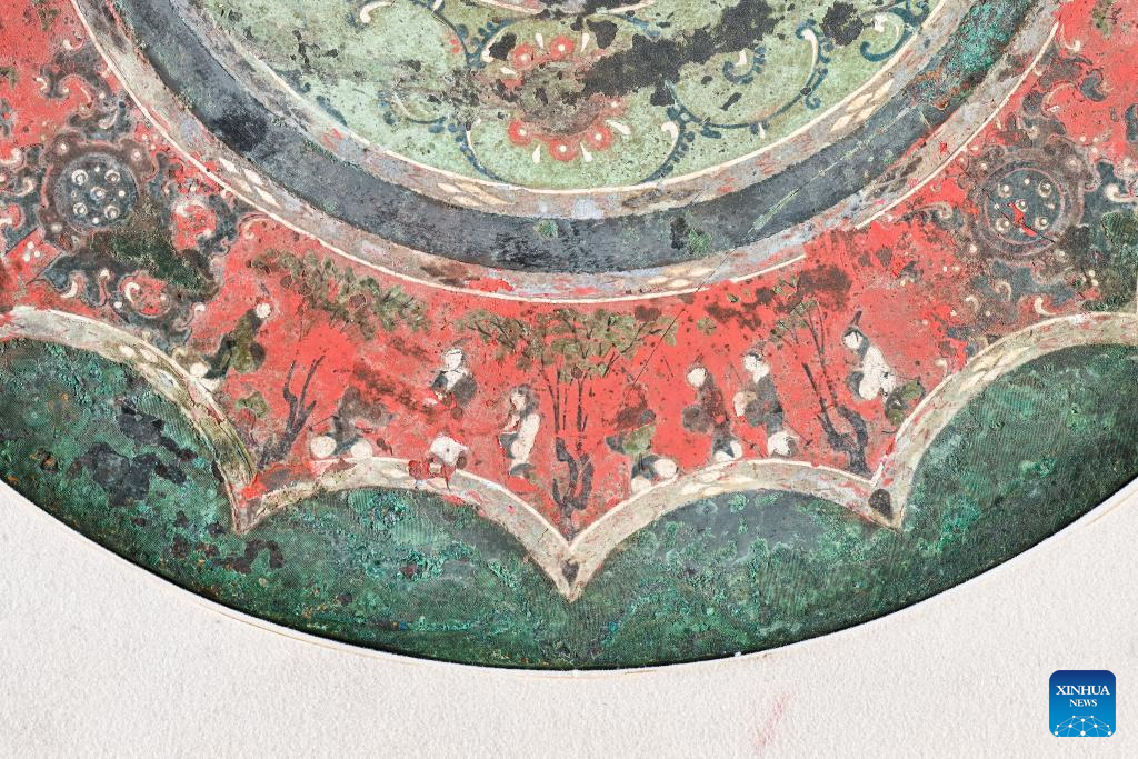 This photo taken on Aug. 25, 2023 shows part of a bronze mirror with colored patterns depicting an audience activity, collected at Xi'an Museum in Xi'an, northwest China's Shaanxi Province. (Xinhua/Li He)