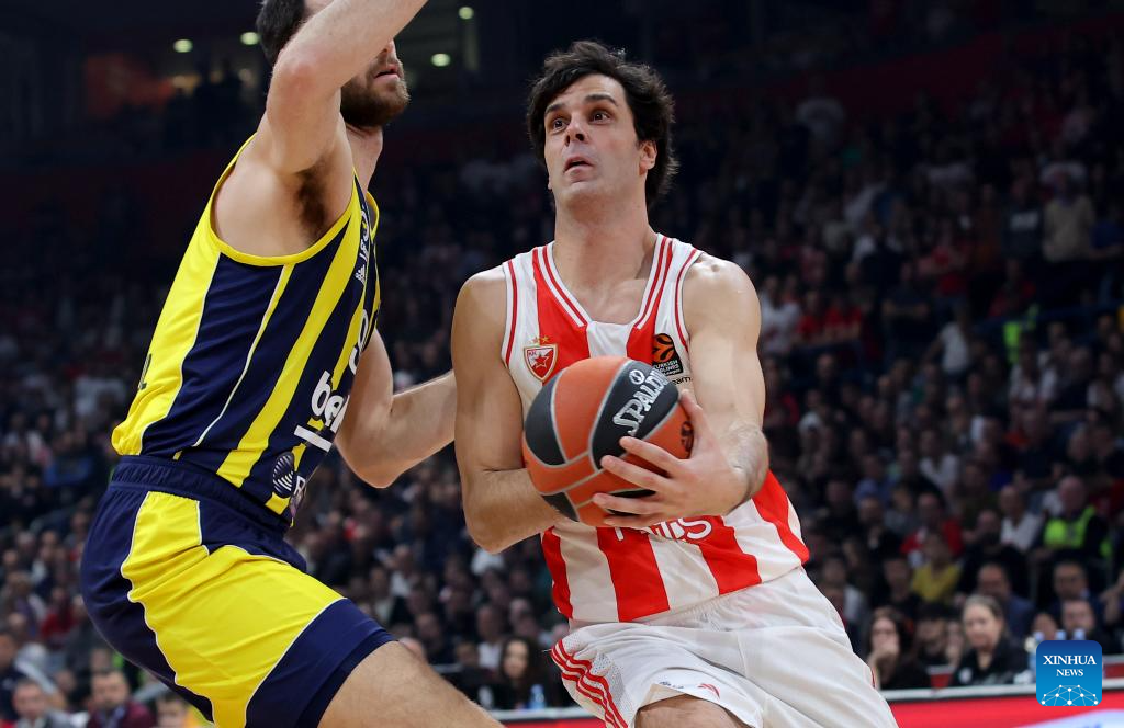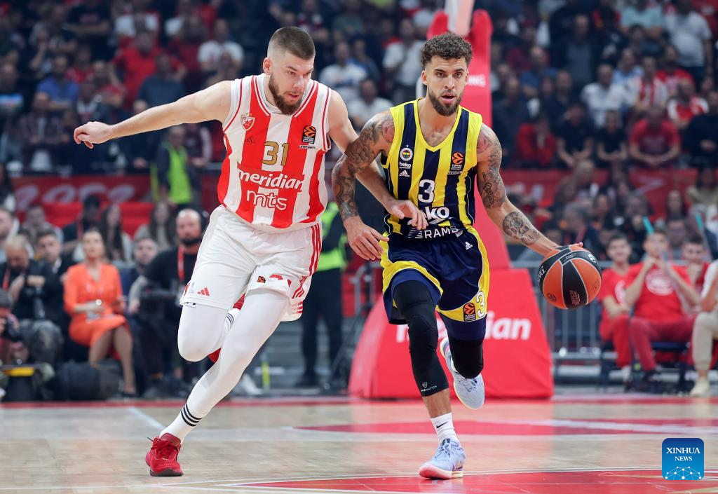 Fenerbahce's Scottie Wilbekin (R) vies with Crvena Zvezda's Rokas Giedraitis during Round 8 match between Crvena Zvezda Meridianbet Belgrade and Fenerbahce Beko Istanbul at Euroleague basketball in Belgrade, Serbia, on Nov. 14, 2023. (Photo by Predrag Milosavljevic/Xinhua)