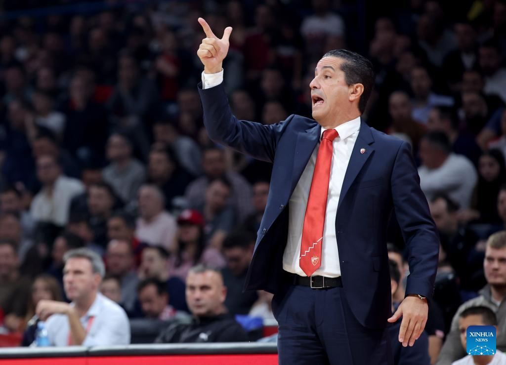 Crvena Zvezda's head coach Ioannis Sfairopoulos gestures during Round 8 match between Crvena Zvezda Meridianbet Belgrade and Fenerbahce Beko Istanbul at Euroleague basketball in Belgrade, Serbia, on Nov. 14, 2023. (Photo by Predrag Milosavljevic/Xinhua)