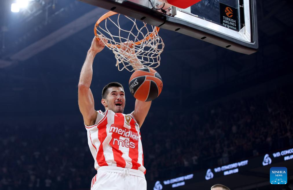 Crvena Zvezda's Luka Mitrovic dunks during Round 8 match between Crvena Zvezda Meridianbet Belgrade and Fenerbahce Beko Istanbul at Euroleague basketball in Belgrade, Serbia, on Nov. 14, 2023. (Photo by Predrag Milosavljevic/Xinhua)