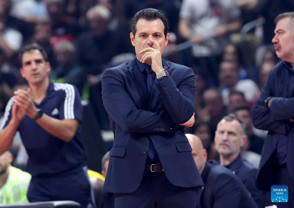 Fenerbahce's head coach Dimitris Itoudis reacts during Round 8 match between Crvena Zvezda Meridianbet Belgrade and Fenerbahce Beko Istanbul at Euroleague basketball in Belgrade, Serbia, on Nov. 14, 2023. (Photo by Predrag Milosavljevic/Xinhua)