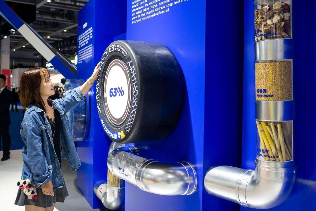 A Michelin racing tire that contains 63 percent of environmentally sustainable materials is exhibited at the sixth China International Import Expo, Nov. 5. (People's Daily Online/Weng Qiyu)