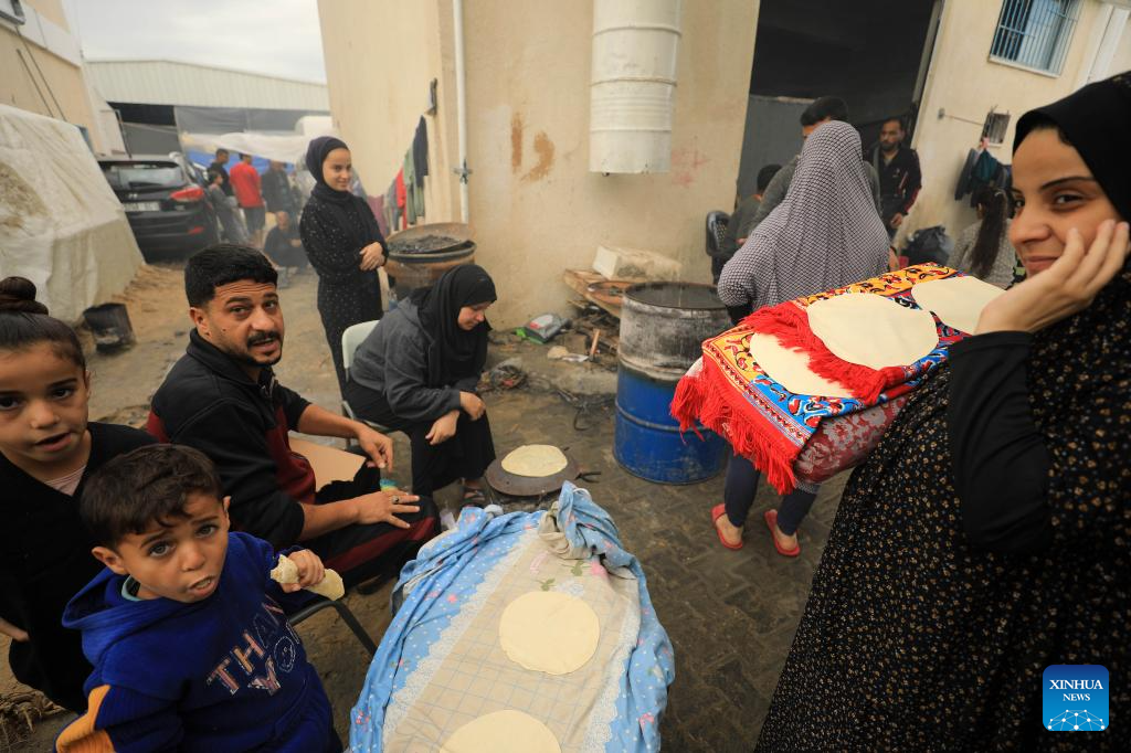 Displaced people prepare food at a temporary shelter in the southern Gaza Strip city of Khan Younis, on Nov. 15, 2023. According to the UN Relief and Works Agency for Palestine Refugees in the Near East (UNRWA), almost 1.5 million people have been displaced across the Gaza Strip since October 7, when Hamas carried out a surprise attack on southern Israel. (Photo by Yasser Qudih/Xinhua)