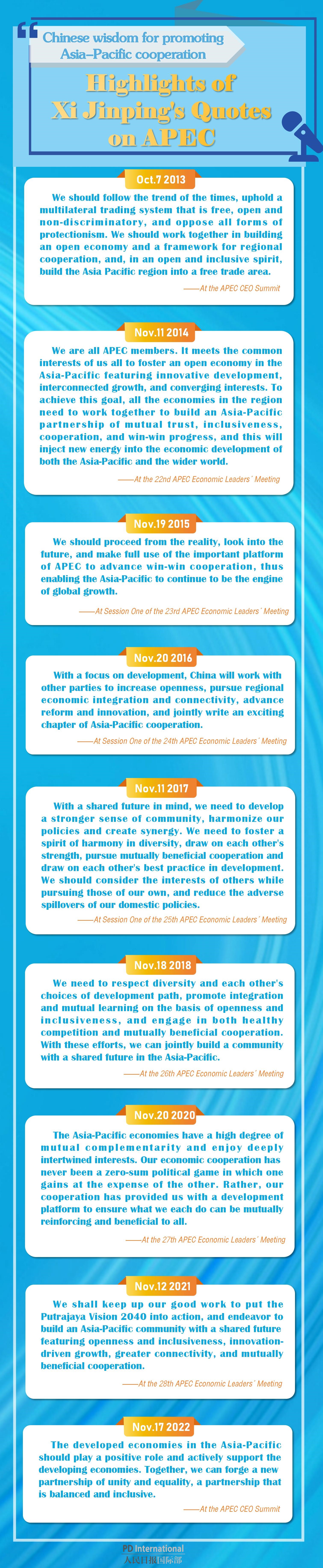 Since 2013, Xi has attended or chaired APEC Economic Leaders' Meetings and delivered important speeches.