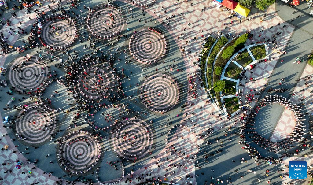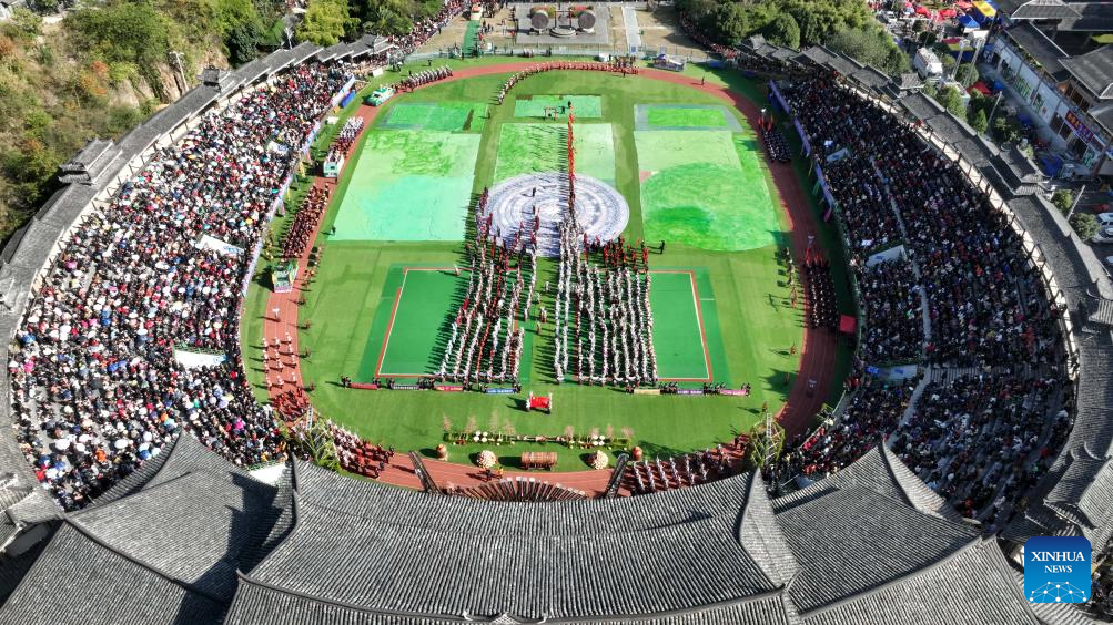 This aerial photo taken on Nov. 16, 2023 shows people of Miao ethnic group participating in a parade during celebrations of the Miao New Year and Guzang Festival in Leishan County of Qiandongnan Miao and Dong Autonomous Prefecture, southwest China's Guizhou Province. Guzang Festival is the most important festival for the Miao people to offer sacrifice to their ancestors. This year's Guzang Festival and Miao New Year fall on the same day, which merits grander celebrations. (Xinhua/Yang Ying)