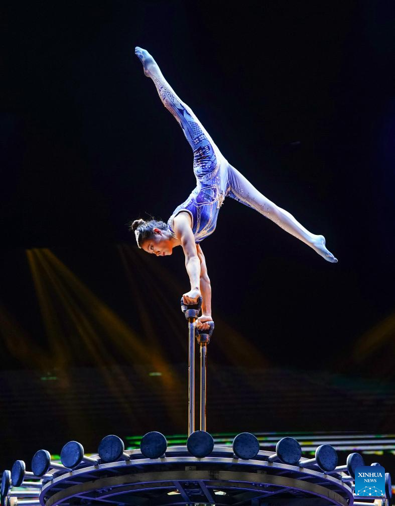 An actress performs during an acrobatic show in Beijing, capital of China, Nov. 17, 2023. A two-day acrobatic show kicked off in Beijing on Saturday. Eleven acrobatic art performing groups across the country bring 12 programs to the show. (Xinhua/Chen Yehua)