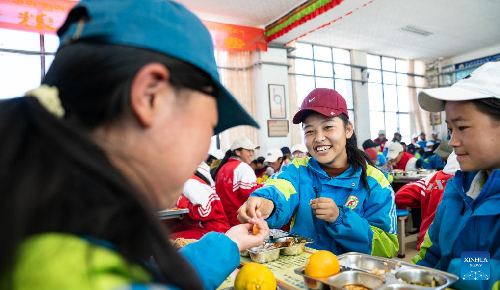 Sichod Drolma (C) has lunch at Damxung County Middle School in Damxung County, southwest China's Xizang Autonomous Region, Nov. 10, 2023.