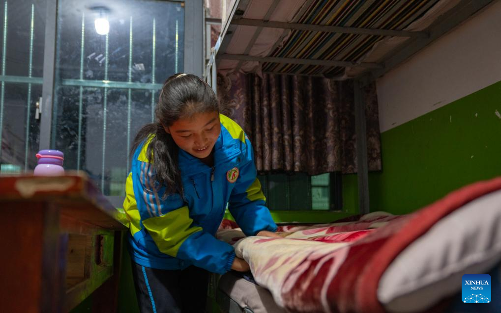 Sichod Drolma arranges her bed and prepares to sleep in the dormitory at Damxung County Middle School in Damxung County, southwest China's Xizang Autonomous Region, Nov. 9, 2023.
