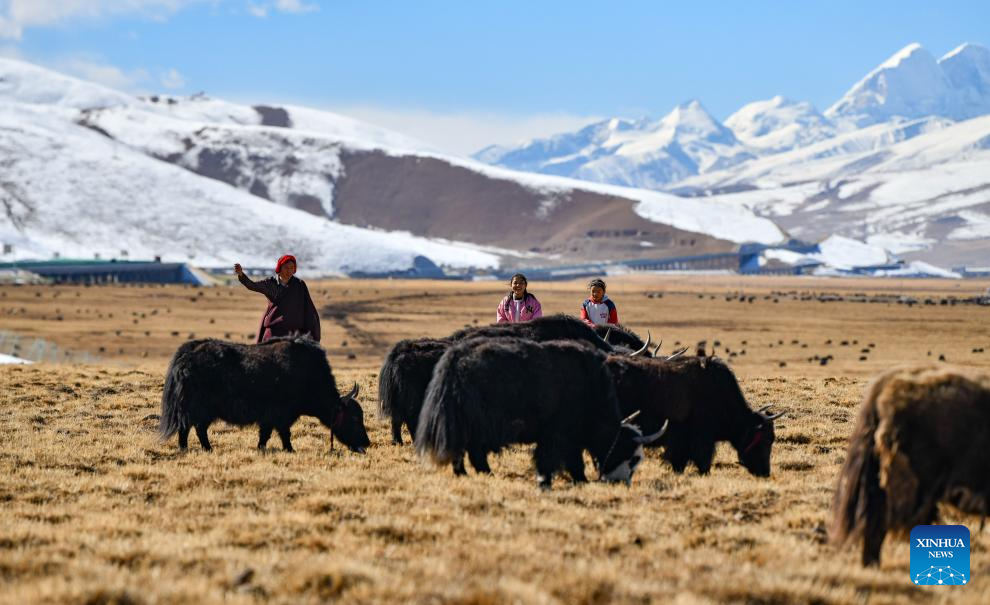 Sichod Drolma (C) and her father and sister pasture on the grassland in Damxung County, southwest China's Xizang Autonomous Region, Nov. 15, 2023.