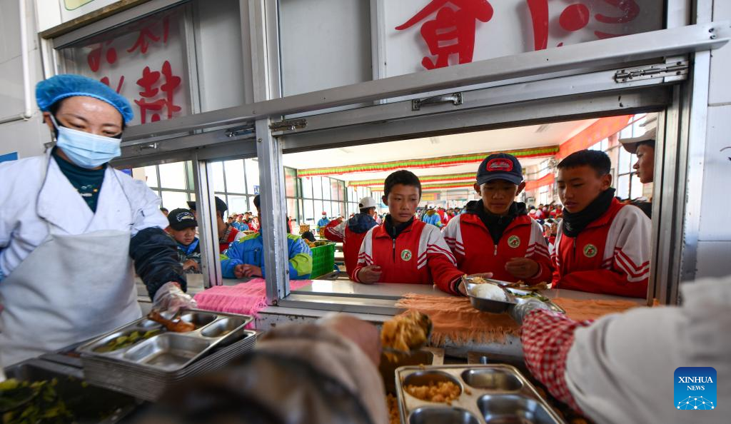 Students have lunch in a canteen at Damxung County Middle School in Damxung County, southwest China's Xizang Autonomous Region, Nov. 10, 2023.