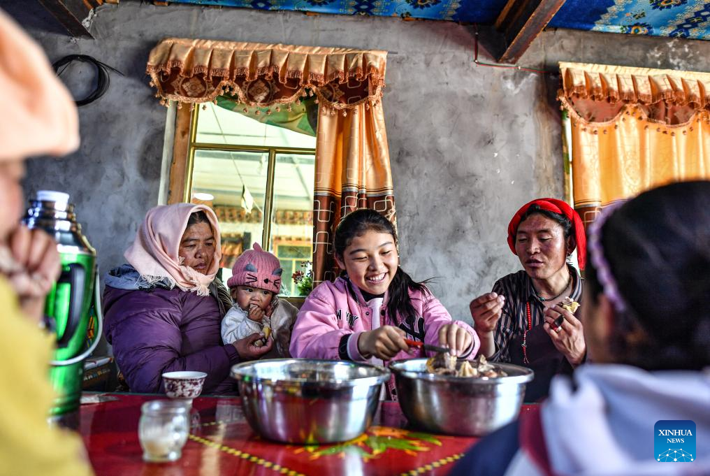 Sichod Drolma (C) eats with her family in Damxung County, southwest China's Xizang Autonomous Region, Nov. 15, 2023.