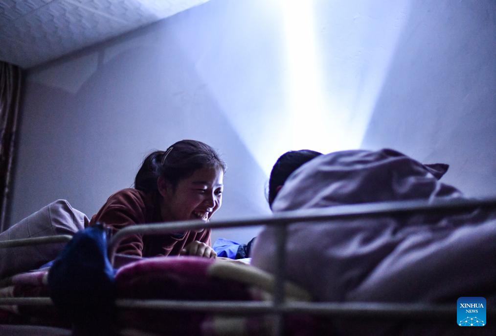 Sichod Drolma (L) chats with her roommate in dormitory at Damxung County Middle School in Damxung County, southwest China's Xizang Autonomous Region, Nov. 9, 2023.