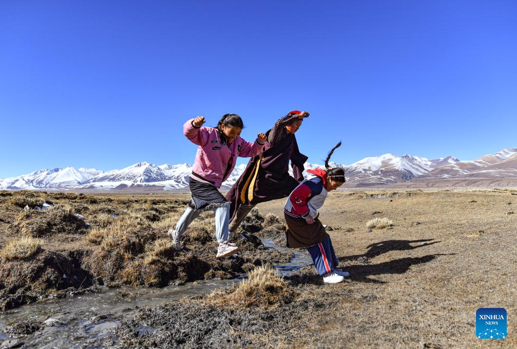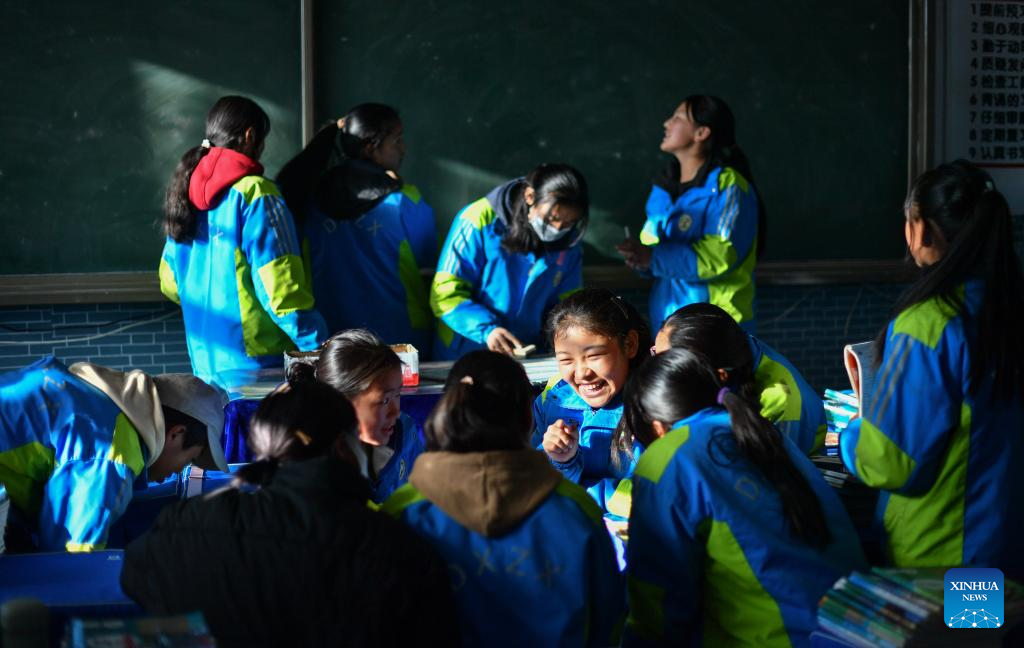 Sichod Drolma (C) and her classmates are pictured during a class-break at Damxung County Middle School in Damxung County, southwest China's Xizang Autonomous Region, Nov. 10, 2023.