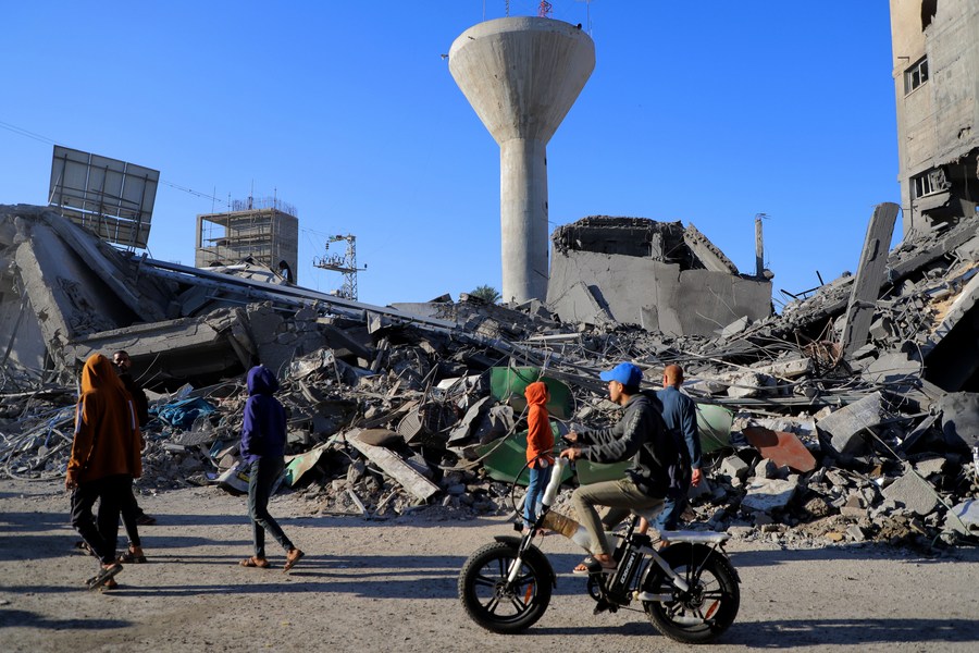 People walk past the rubble of buildings destroyed in Israeli military operations in the southern Gaza Strip city of Khan Younis on Nov. 17, 2023. (Photo by Rizek Abdeljawad/Xinhua)