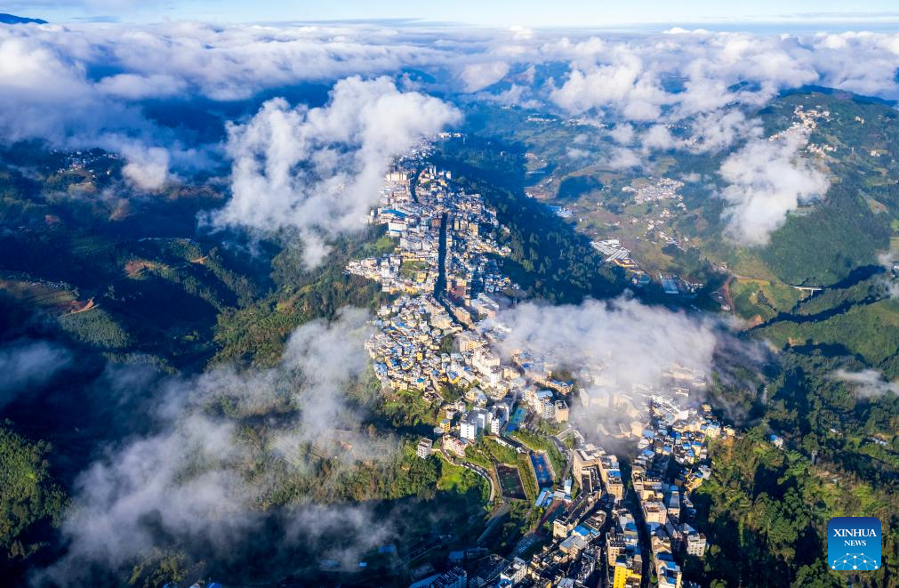 This aerial photo taken on Nov. 19, 2023 shows a view of Luchun County of Honghe Hani and Yi Autonomous Prefecture, southwest China's Yunnan Province. The long street banquet, a time-honoured tradition of Hani ethnic group in China, was held here during a cultural tourism festival on Sunday. (Xinhua/Chen Xinbo)