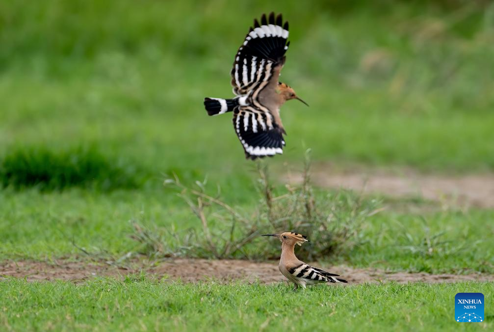 Hoopoes are pictured in the Minjiang River estuary wetland in southeast China's Fujian Province, Nov. 15, 2023. (Xinhua/Wei Peiquan)