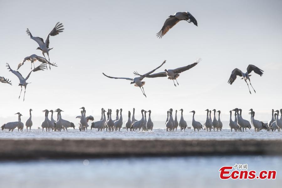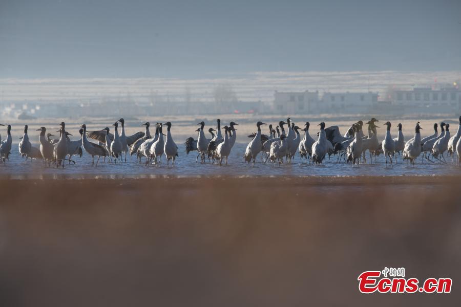 Black-necked cranes forage and play at a protection zone in Linzhou County, northern Lhasa, Southwest China's Tibet Autonomous Region, Nov. 19, 2023.(Photo/China News Service)