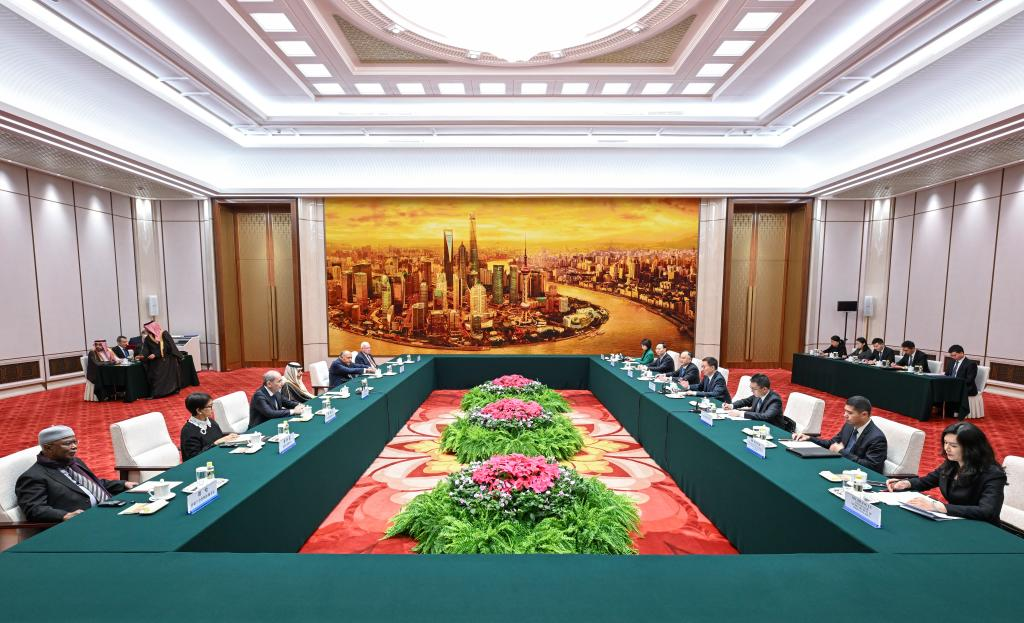 Chinese Vice President Han Zheng meets with a delegation of Arab and Islamic foreign ministers led by Saudi Foreign Minister Prince Faisal bin Farhan Al Saud (L), grouping foreign ministers from Jordan, Egypt, Palestine, and Indonesia, and the secretary general of the Organisation of Islamic Cooperation, in Beijing, capital of China, Nov. 20, 2023. (Xinhua/Zhang Ling)