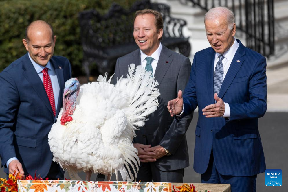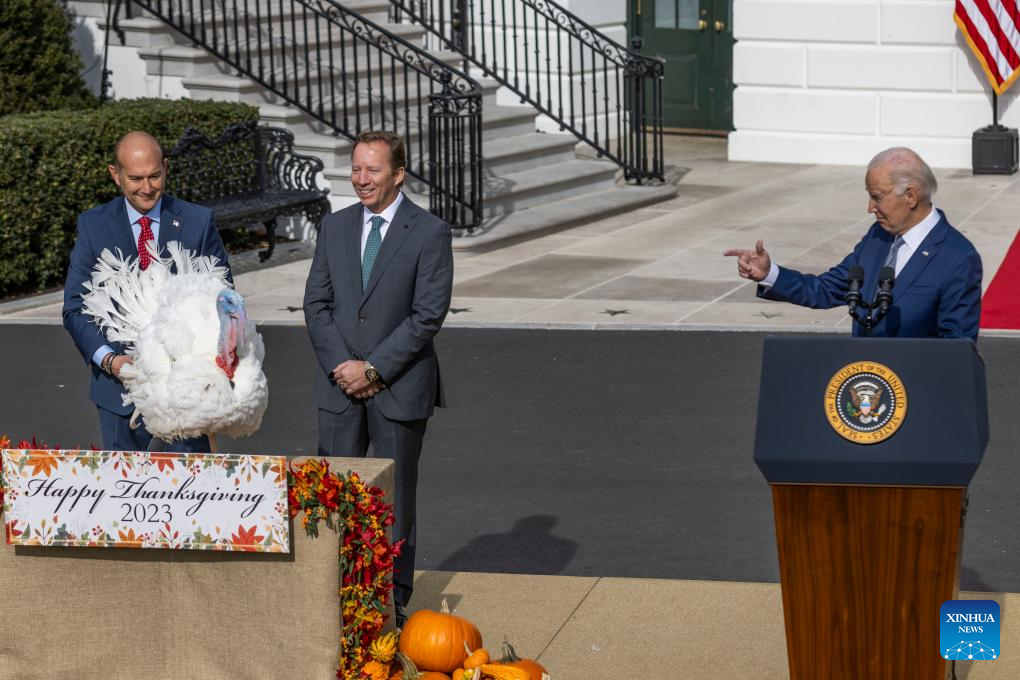 U.S. President Joe Biden (R) attends the National Thanksgiving Turkey Pardoning Ceremony at the White House in Washington, D.C., the United States, on Nov. 20, 2023. (Photo by Aaron Schwartz/Xinhua)