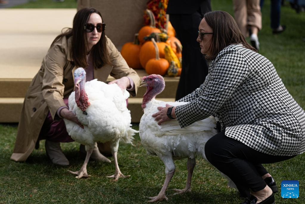 Pardoned turkeys are seen during the National Thanksgiving Turkey Pardoning Ceremony at the White House in Washington, D.C., the United States, on Nov. 20, 2023. (Photo by Aaron Schwartz/Xinhua)