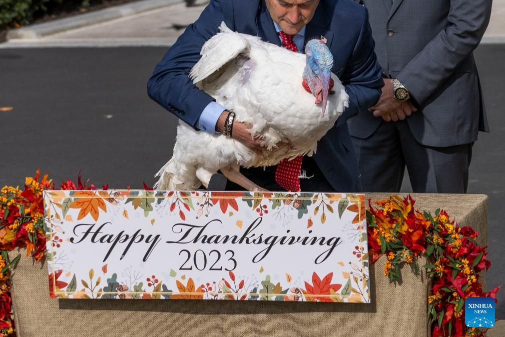 One of the pardoned turkeys is seen during the National Thanksgiving Turkey Pardoning Ceremony at the White House in Washington, D.C., the United States, on Nov. 20, 2023. (Photo by Aaron Schwartz/Xinhua)