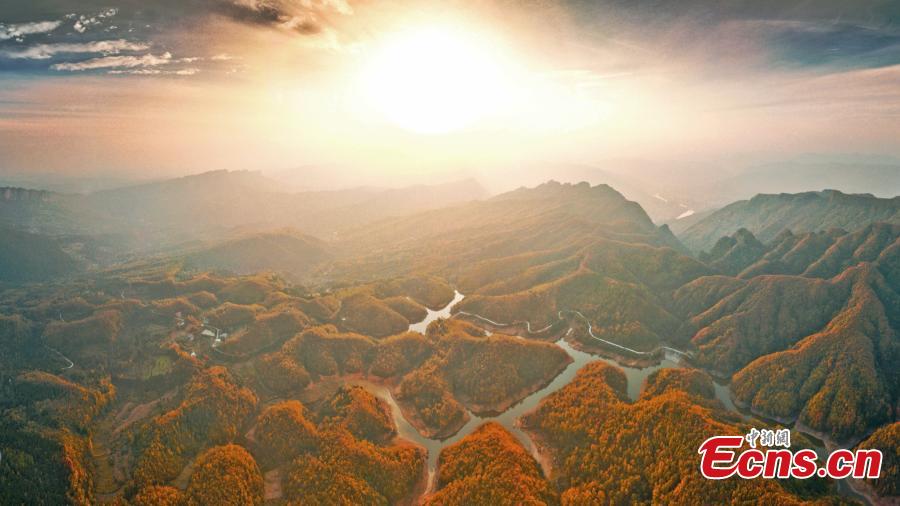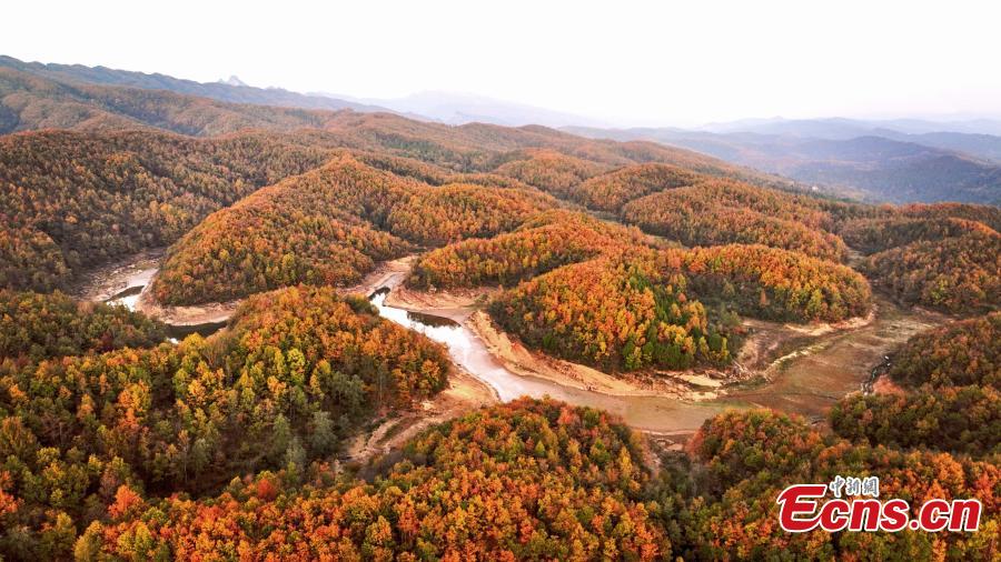Aerial view of beautiful forest landscape at Yingxiong reservoir in Guangyuan, southwest China's Sichuan Province in early winter. (Photo: China News Service/Miao Zhiyong)
