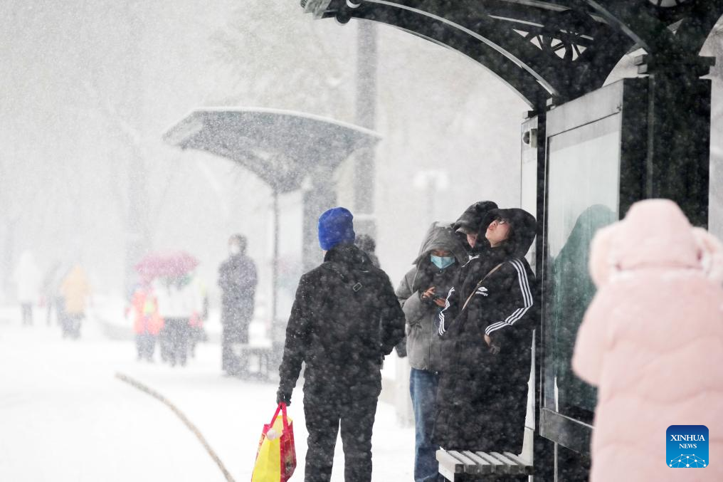 People wait for buses in the snow in Harbin, capital of northeast China's Heilongjiang Province, Nov. 22, 2023. (Xinhua/Wang Jianwei)