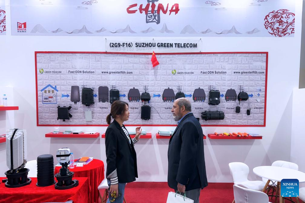 A visitor talks with an exhibitor at the booth of China's Suzhou Green Telecom at the Cairo ICT 2023 expo in Cairo, Egypt, on Nov. 21, 2023. Egypt has hosted the 27th edition of Cairo ICT 2023 expo, the country's largest information and communications technology (ICT) exhibition, as the north African country seeks to facilitate a digital transformation via clinching win-win business deals. (Xinhua/Ahmed Gomaa)