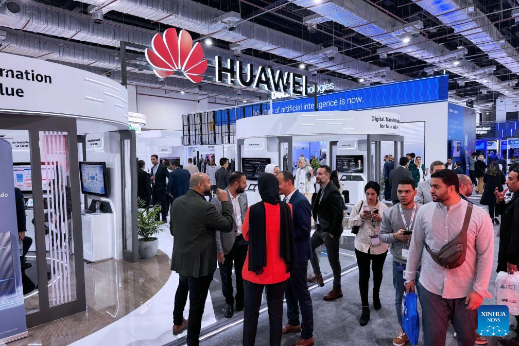 People visit the booth of Chinese tech giant Huawei at the Cairo ICT 2023 expo in Cairo, Egypt, on Nov. 21, 2023. Egypt has hosted the 27th edition of Cairo ICT 2023 expo, the country's largest information and communications technology (ICT) exhibition, as the north African country seeks to facilitate a digital transformation via clinching win-win business deals. (Xinhua/Ahmed Gomaa)
