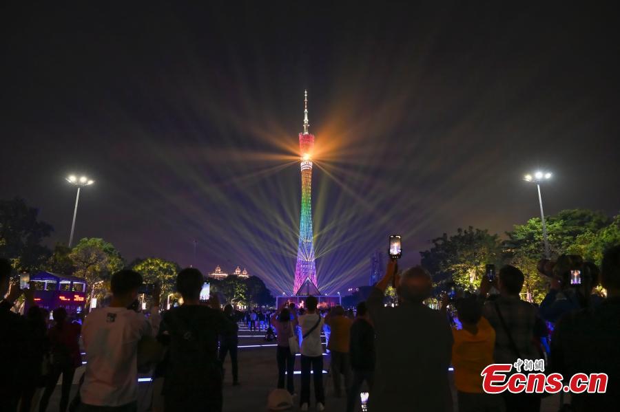 The Canton Tower and skyscrapers are illuminated during the 12th Guangzhou international light festival in south China's Guangdong Province, Nov. 21, 2023. (Photo: China News Service/Chen Jimin)