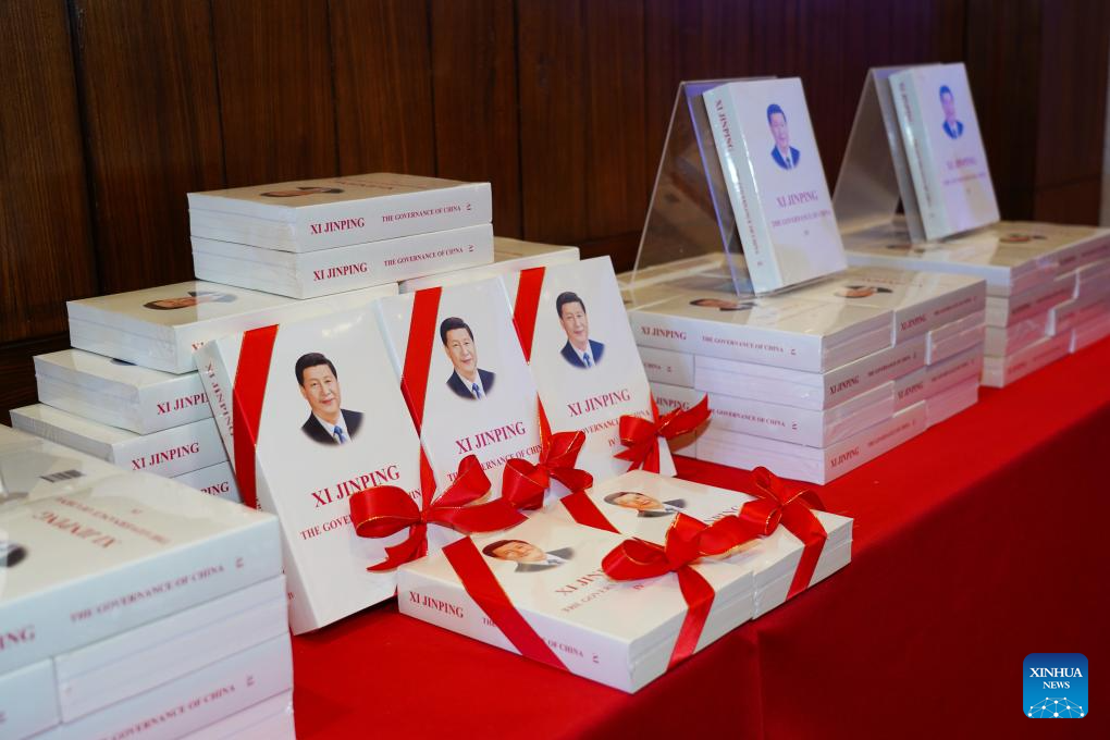 This photo taken on Nov. 23, 2023 shows the English version of the fourth volume of "Xi Jinping: The Governance of China" during a promotional event in Kathmandu, Nepal. Jhala Nath Khanal, former prime minister of Nepal, attended the promotional event here on Thursday. (Photo by Hari Maharjan/Xinhua)