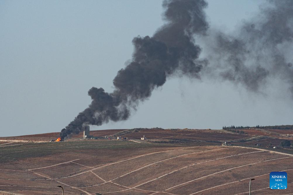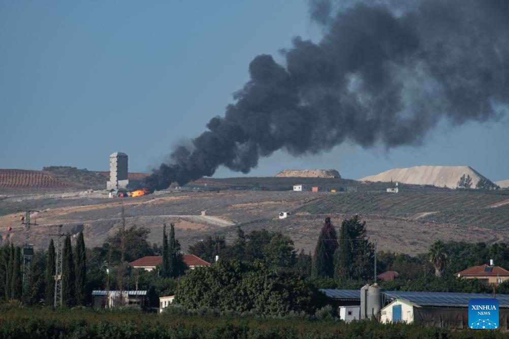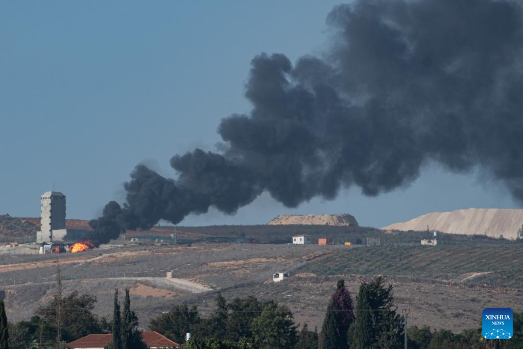 Flames and smoke rise from an agricultural structure in southern Lebanon, as seen from Kiryat Shmona in northern Israel bordering Lebanon, following bombardment by the Israeli army, on Nov. 23, 2023. Two people were killed and five others were injured on Thursday in Israeli airstrikes on southern Lebanon, the Lebanese militant group Hezbollah and military sources said. (Ayal Margolin/JINI via Xinhua)