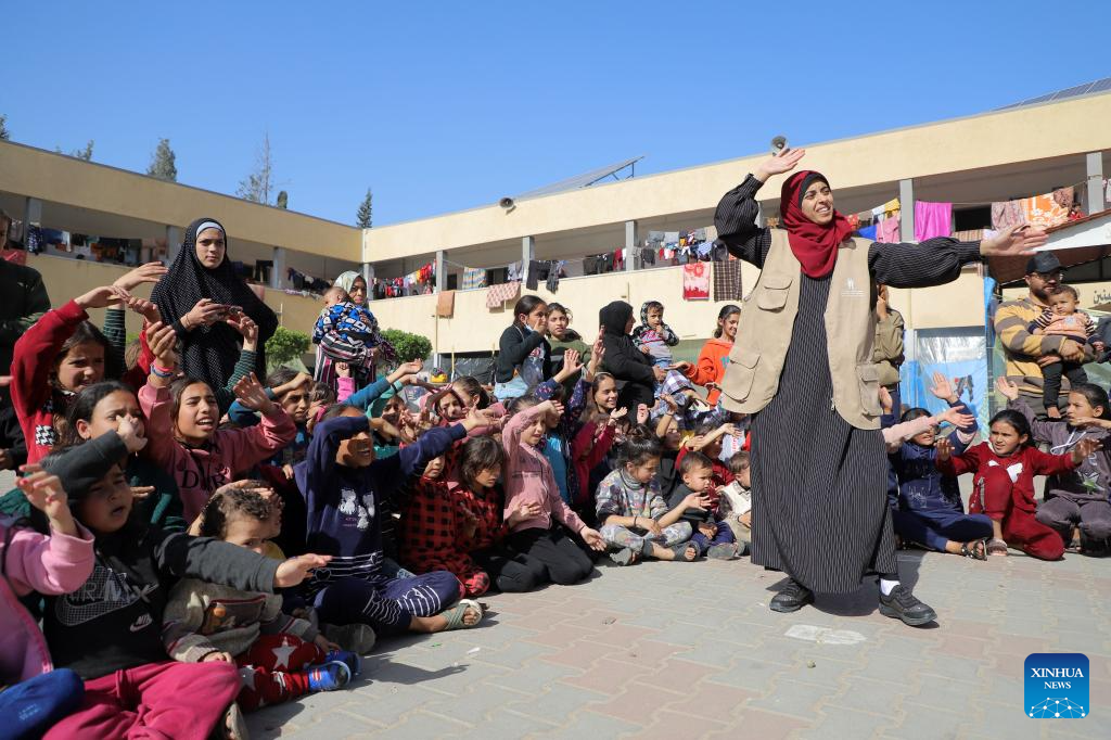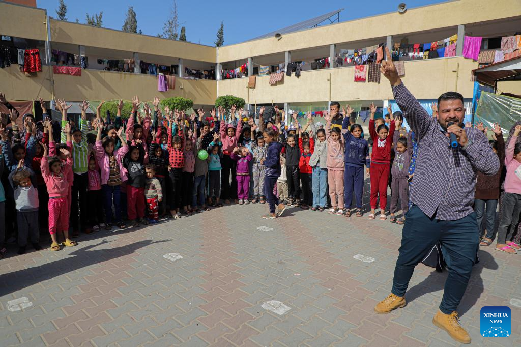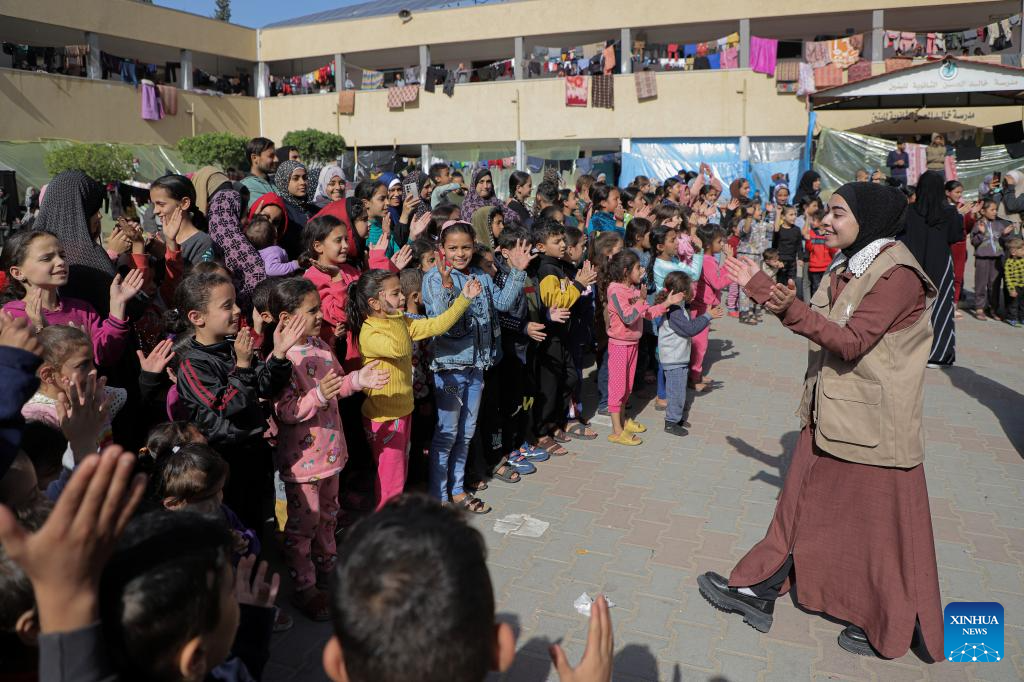 A volunteer interacts with children during a psychological stimulation and relief activity at a school affiliated to the United Nations Relief and Works Agency for Palestine Refugees (UNRWA) in the southern Gaza Strip city of Khan Younis, Nov. 23, 2023. (Photo by Rizek Abdeljawad/Xinhua)
