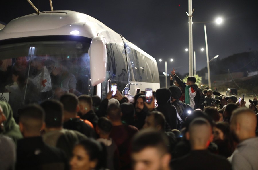 GAZA/CAIRO, Nov. 24 (Xinhua) -- As a cease-fire with Israel entered into force, Hamas on Friday released 24 hostages, including 13 Israelis, while buses carrying 39 Palestinian prisoners departed at night from Israeli Ofer prison.