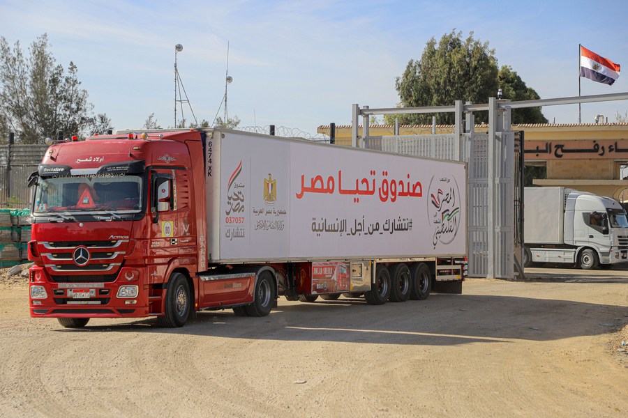 A truck with humanitarian aid enters the Gazan side of the Rafah crossing, on Nov. 24, 2023. (Photo by Rizek Abdeljawad/Xinhua)