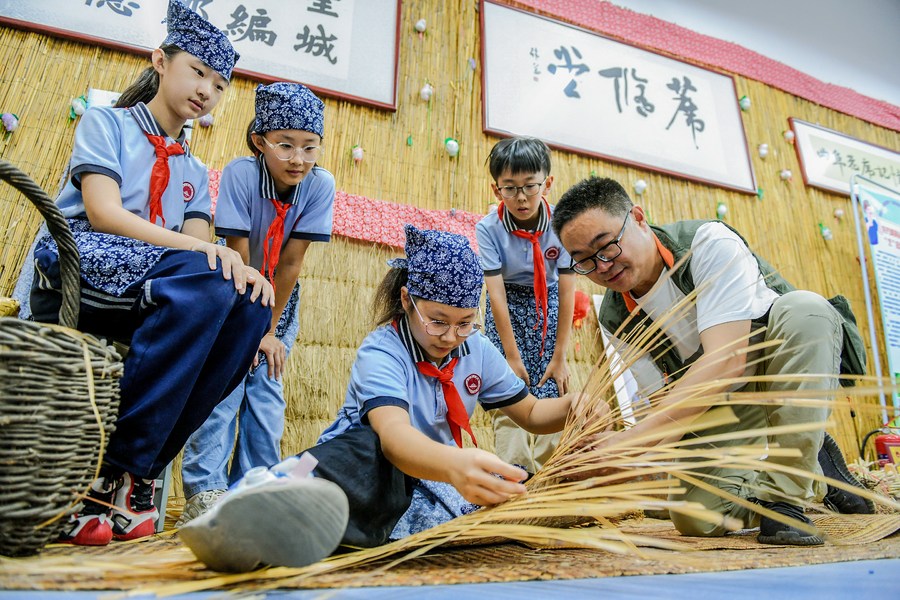 An inheritor of a traditional craft of weaving "Huaxi" teaches students to make weaving artworks at a school in Qufu City, east China's Shandong Province, Oct. 6, 2023. (Photo by Yang Guoqing/Xinhua)