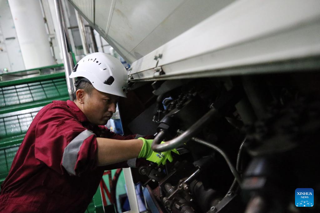 Wang Fa, a machinist, checks and tightens constraining gears aboard China's research icebreaker Xuelong 2, on Nov. 26, 2023. Currently on an Antarctic expedition, the icebreaker, otherwise known as Snow Dragon 2, is ploughing through the belt of prevailing westerlies, nicknamed the "rolling forties," with its companion cargo vessel Tian Hui. (Xinhua/Zhou Yuan)