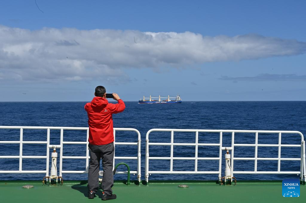 This aerial photo shows China's research icebreaker Xuelong 2 (front) and cargo vessel Tian Hui sailing in the belt of prevailing westerlies on Nov. 25, 2023. Currently on an Antarctic expedition, the icebreaker, otherwise known as Snow Dragon 2, is ploughing through the belt of prevailing westerlies, nicknamed the "rolling forties," with its companion cargo vessel Tian Hui. (Photo by Chen Dongbin/Xinhua)
