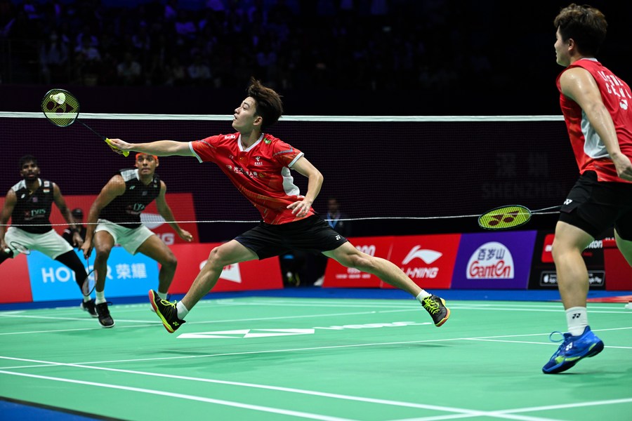 Liang Weikeng (1st R)/Wang Chang (2nd R) of China compete in the men's doubles final against Chirag Shetty/Satwiksairaj Rankireddy of India at the China Masters Badminton Tournament 2023 in Shenzhen, south China's Guangdong Province, Nov. 26, 2023. (Xinhua/Mao Siqian)