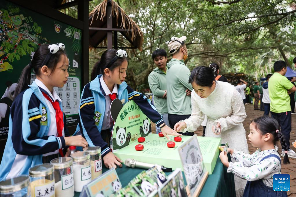 Visitors play an interactive game at the Hainan Tropical Wildlife Park and Botanical Garden in Haikou, south China's Hainan Province, Nov. 25, 2023. Giant pandas Gonggong and Shunshun have lived in Hainan for five years since they made their public debut at the Hainan Tropical Wildlife Park and Botanical Garden in 2018. A celebration ceremony was held here on Saturday, attracting lots of visitors. (Xinhua/Zhang Liyun)